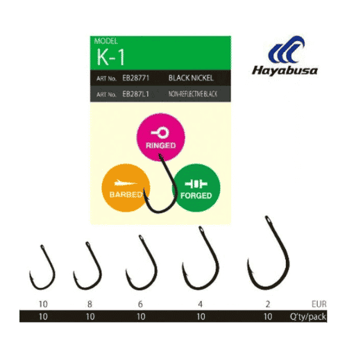 Hayabusa K1 este un carlig cu ochet drept, tija medie si robusta si varf extrem de ascutit, conceput pentru pescuitul pestilor de talie medie si mare. Carligele sunt fabricate din otel, iar varful ascutit cu o tehnologie speciala le confera o durata de viata indelungata. Acest carlig este ideal pentru pescuitul in agatatura si zone cu pietris, de asemenea dispune de un finisaj negru mat ce ii confera un camuflaj excelent pe substrat.