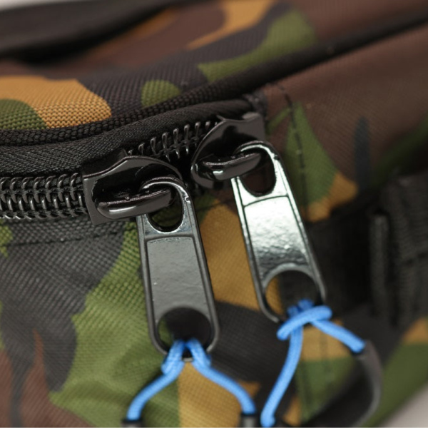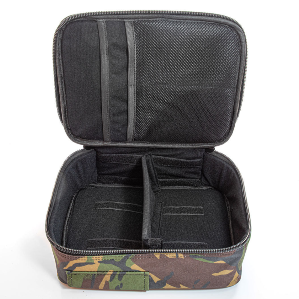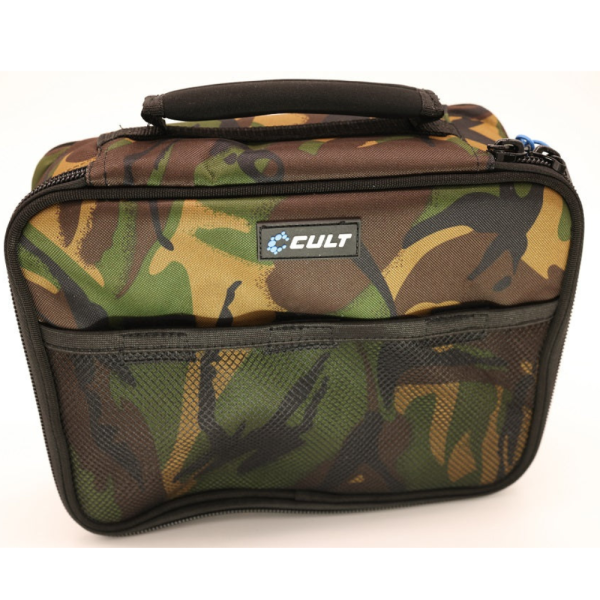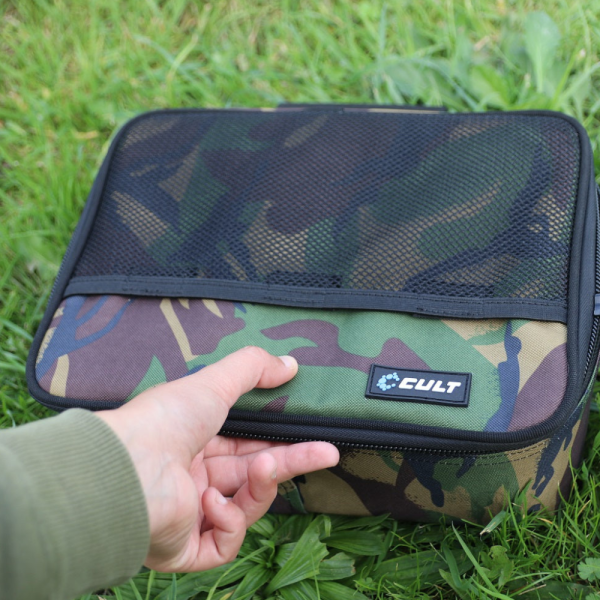 Cult Tackle DPM Camo Gadget Case are partea superioară a carcasei fixată cu fermoare supradimensionate marca Cult, iar interiorul este prevăzut cu un buzunar căptușit și cu două buzunare practice, cu plasă, pentru a depozita cablurile, adaptoarele etc. importante. În exteriorul husei se află un spatiu mare cu plasă pentru orice gadgeturi/accesorii care trebuie să fie ușor de accesat în timpul sesiunii.