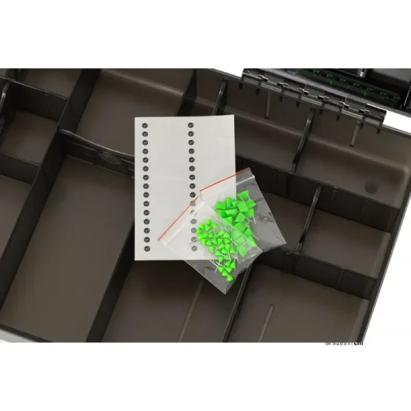 Această cutie de scule versatilă este perfect adaptată pentru orice utilizator, având 25 de compartimente individuale integrate în capac. Fiecare secțiune este acoperită cu un capac transparent, care nu doar că securizează obiectele, dar permite și identificarea rapidă a conținutului. De la inele, tuburi shrink și kickers până la Heli-Safes, aceste compartimente organizează eficient toate micile accesorii de terminal.