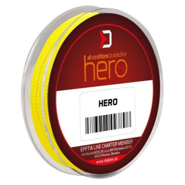Fir Textil Delphin HERO 4, Galben Fluo, 300m este un fir textil confectionat prin impletirea a 4 microfibre PE. S-a obtinut astfel un fir puternic si foarte rezistent la abraziune si cu o elongatie minima. Suplimentar, suprafata firului este tratata pentru a imbunatati rezistenta si pentru a impiedica absorbtia apei.
