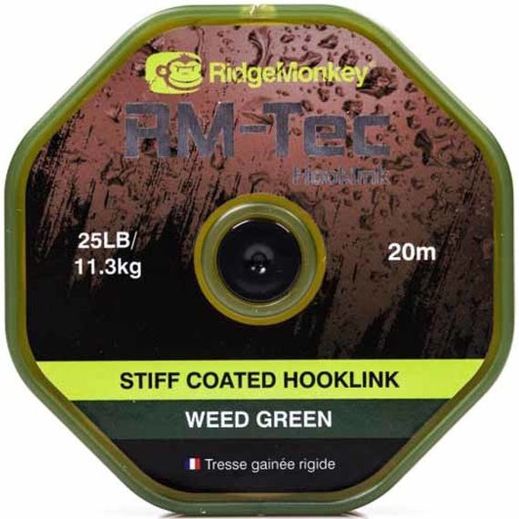 FIR TEXTIL RIDGEMONKEY RM-TEC STIFF COATED HOOKLINK, WEED GREEN este un fir textil camasuit cu scufundare rapida si o rigiditate ce va asigura ca montura nu se va incurca in lansare. Este ideal pentru confectionarea monturilor Combi, camasa putand fii decojita cu ajutorul unui stripper. Culoarea speciala asigura un camuflaj ideal pe substrat fara a da suspiciuni pestilor de talie mare care sunt extrem de precauti. Este un fir rigid ce nu permite monturii sa se incurce, dar care ofera destula libertate momelii in momentul aspirarii de catre crap.