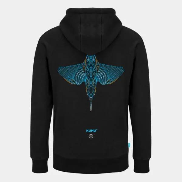 Pentru cei care apreciază designurile originale și de impact, Kumu Take Flight Hoodie este o piesă vestimentară remarcabilă, inspirată de frumusețea și dinamismul păsării kingfisher. Graficul captivant redă cu măiestrie silueta și mișcarea rapidă a acestei păsări iconice, utilizând stilul de ilustrație keyline. Nuanțele electrizante de albastru și cupru adaugă profunzime designului, creând un efect aproape tridimensional.