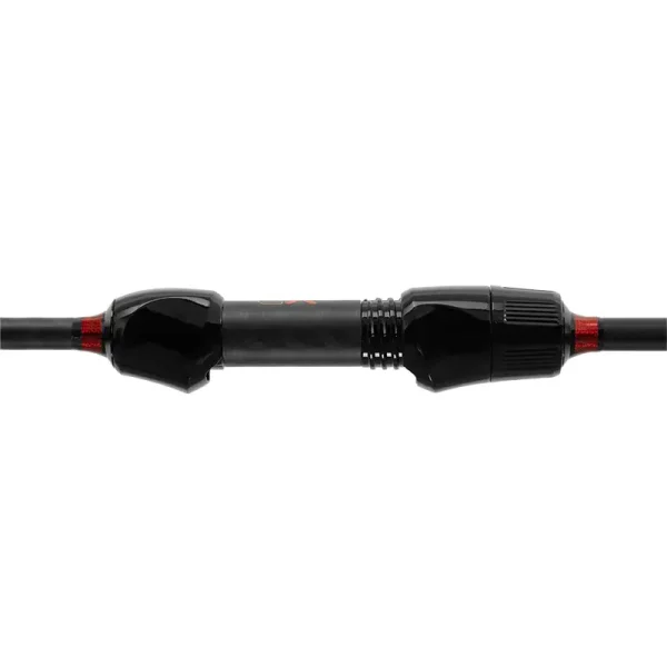 Mânerul distinctiv este realizat din fibre de carbon cu un model texturat, completat de o talpă metalică cu accente negre și roșii, care adaugă un aspect modern și rafinat. Finisajul mat, împreună cu detaliile subtile, conferă lansetei un aspect elegant, potrivit pentru pescarii care apreciază atât performanța, cât și estetica.