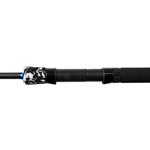 Deasupra mânerului, lanseta este evidențiată de o înfășurare albastră contrastantă, care se completează perfect cu inscripțiile și marcajele distinctive ale seriei. Acest detaliu conferă lansetei un aspect modern și atrăgător, potrivit pentru pescarii care apreciază nu doar funcționalitatea, ci și estetica echipamentului lor.