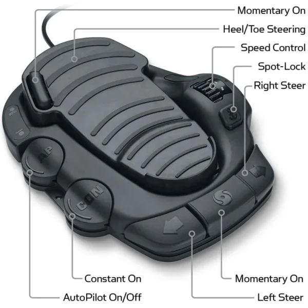 Pedalier Electric: Design ergonomic cu două opțiuni de direcție (heel/toe și butoane), control al vitezei, activare Spot-Lock și cablu de 5,5 metri cu conector impermeabil.