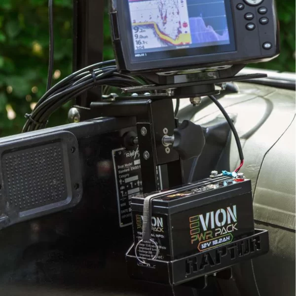 Este un suport pentru bateria/acumulatorul sonarului dumneavoastra. Acest accesoriu practic îți permite să montezi și să alimentezi în siguranță ecranul de adâncime sau sonarul atunci când folosești suportul de sonar Raptor DLX pentru pescuit sau alte activități.
